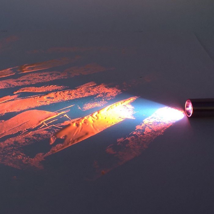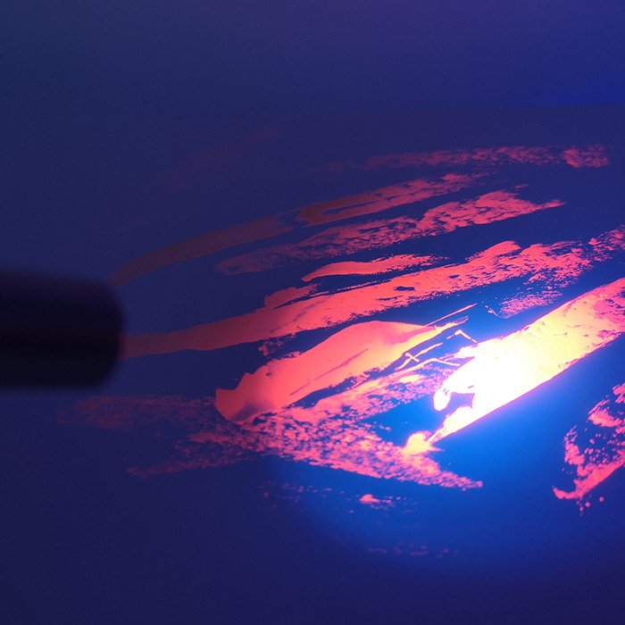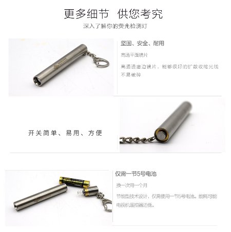 荧光检测筆(bǐ)是一种利用(yòng)紫外線(xiàn)照射荧光承印物(wù)来识别真伪的设备。在365NM紫外線(xiàn)灯的照射下,印刷荧光的特定區(qū)域将发出荧光反射,荧光反射的颜色和形状都可(kě)以作(zuò)為(wèi)防伪鉴别真伪的依据。荧光效果是由纸张和油墨中(zhōng)添加的荧光成分(fēn)共同作(zuò)用(yòng)的结果。