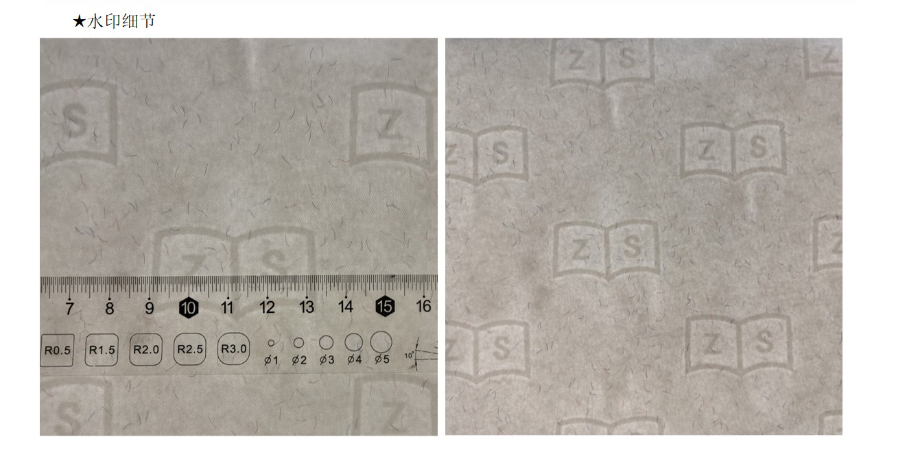 纤维纸:造纸时将红蓝等有(yǒu)色纤维或彩色小(xiǎo)片(点)掺入纸浆内,或在纸张未定型前撒在纸张表面,在紫外線(xiàn)照射下有(yǒu)荧光反射,使纸中(zhōng)带有(yǒu)區(qū)别于纸张本身的有(yǒu)色纤维。掺入纸浆中(zhōng)的红蓝纤维丝和彩点有(yǒu)彩色纤维与无色荧光纤维两种。