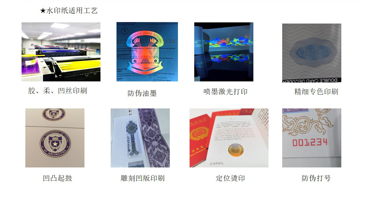 水印纸:水印纸是有(yǒu)浮雕、可(kě)触摸图像、条码等的纸张。钞票用(yòng)的便是水印防伪技(jì )术。因水印不能(néng)用(yòng)影印机、扫描器等再现,故其防伪效果甚受重视。