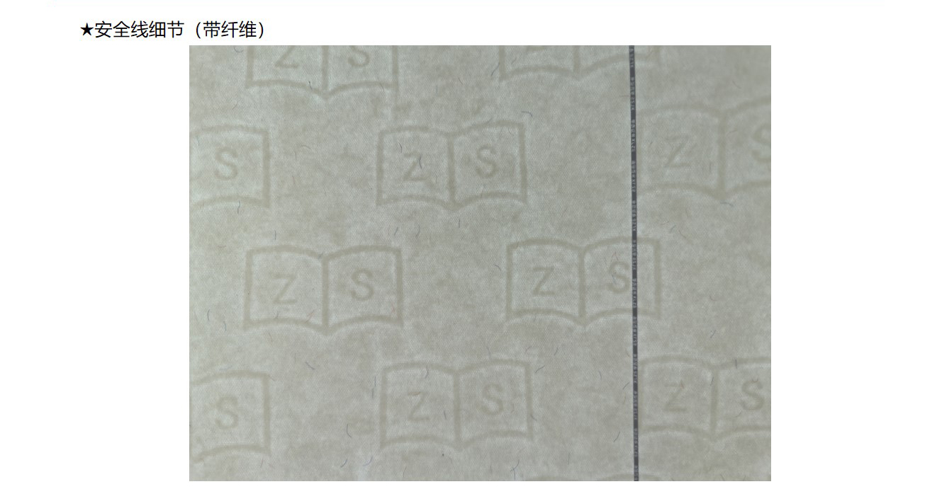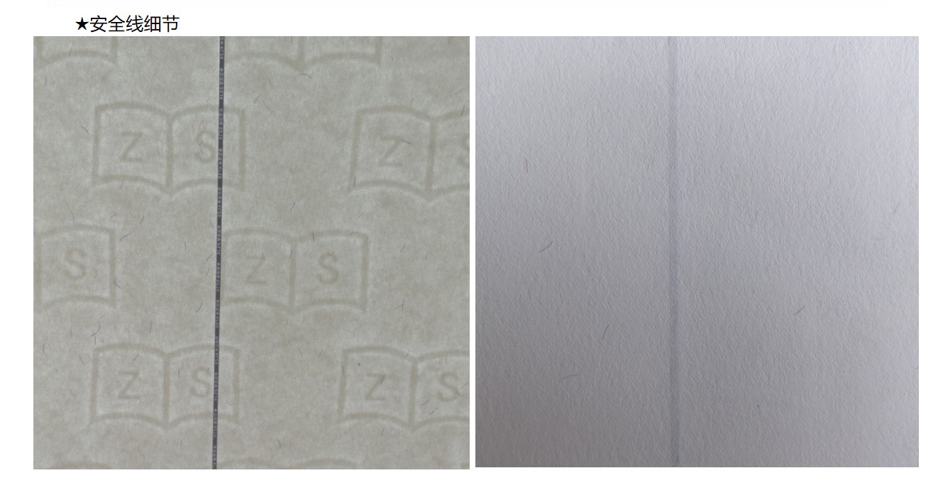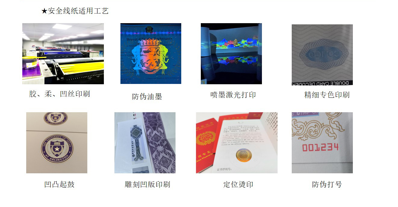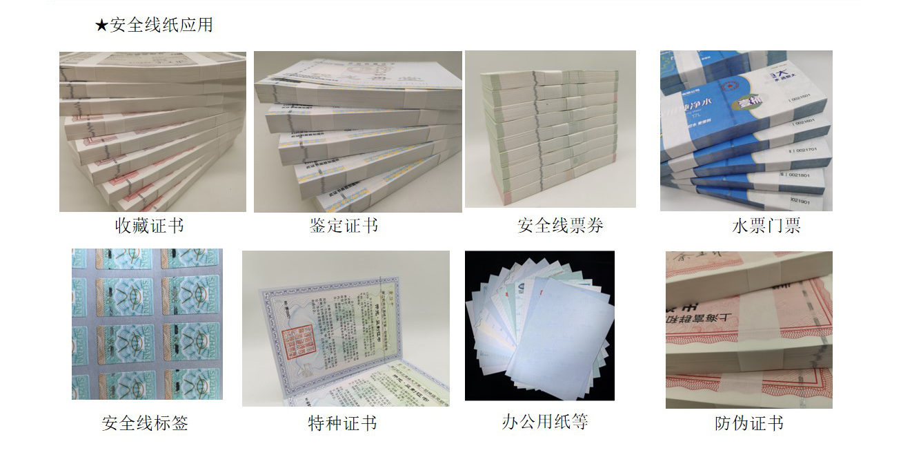 安(ān)全線(xiàn)纸:指造纸过程中(zhōng)将一条金線(xiàn)或塑胶線(xiàn)置于纸张中(zhōng)间。起初使用(yòng)的是特制金属線(xiàn),现在使用(yòng)聚酯类塑胶線(xiàn)、微型字母安(ān)全線(xiàn)、荧光安(ān)全線(xiàn)、磁性線(xiàn)等。