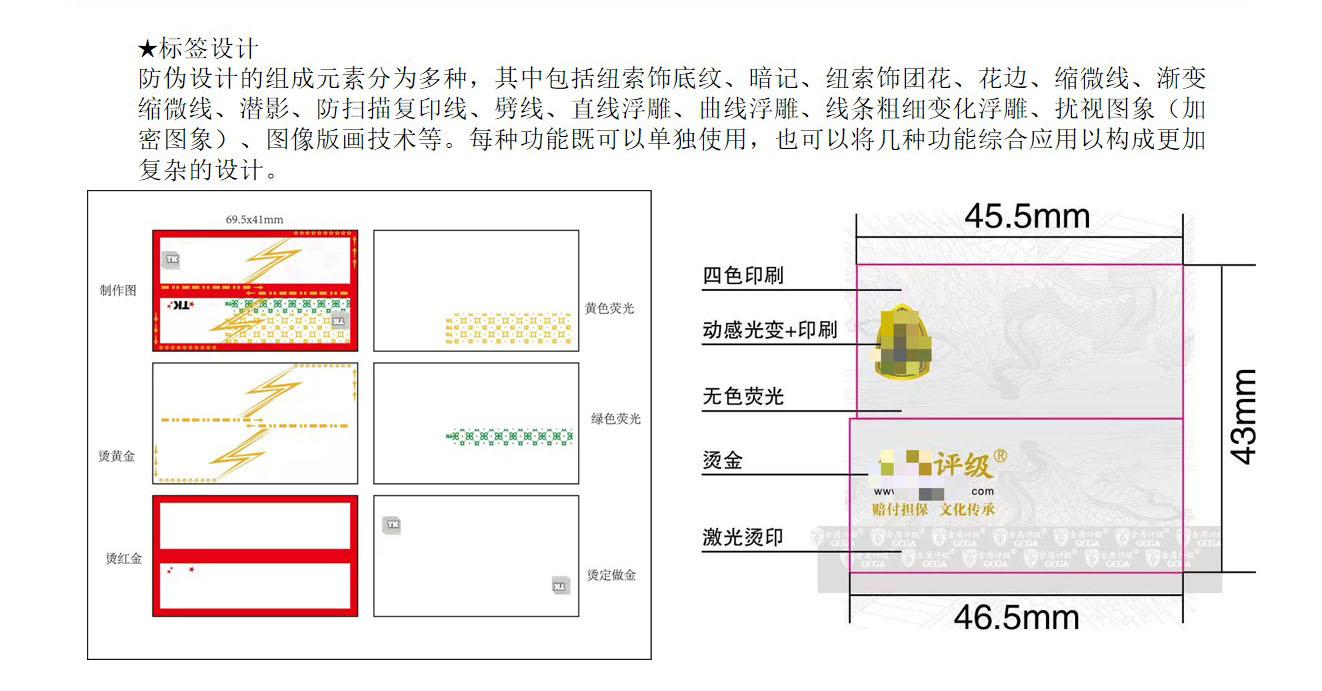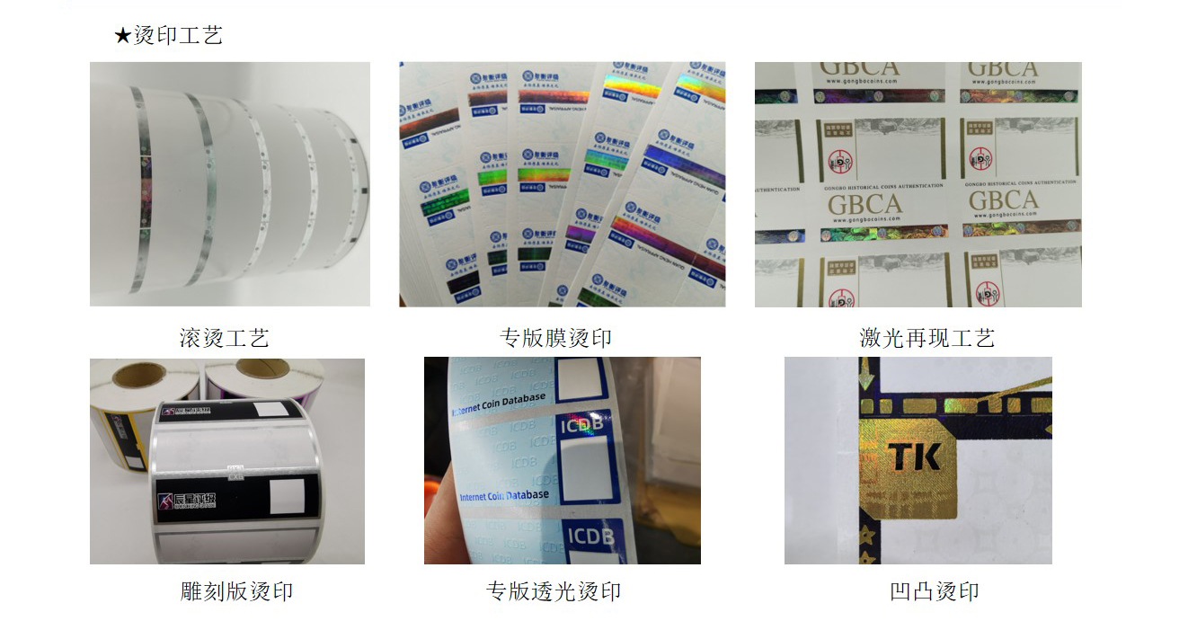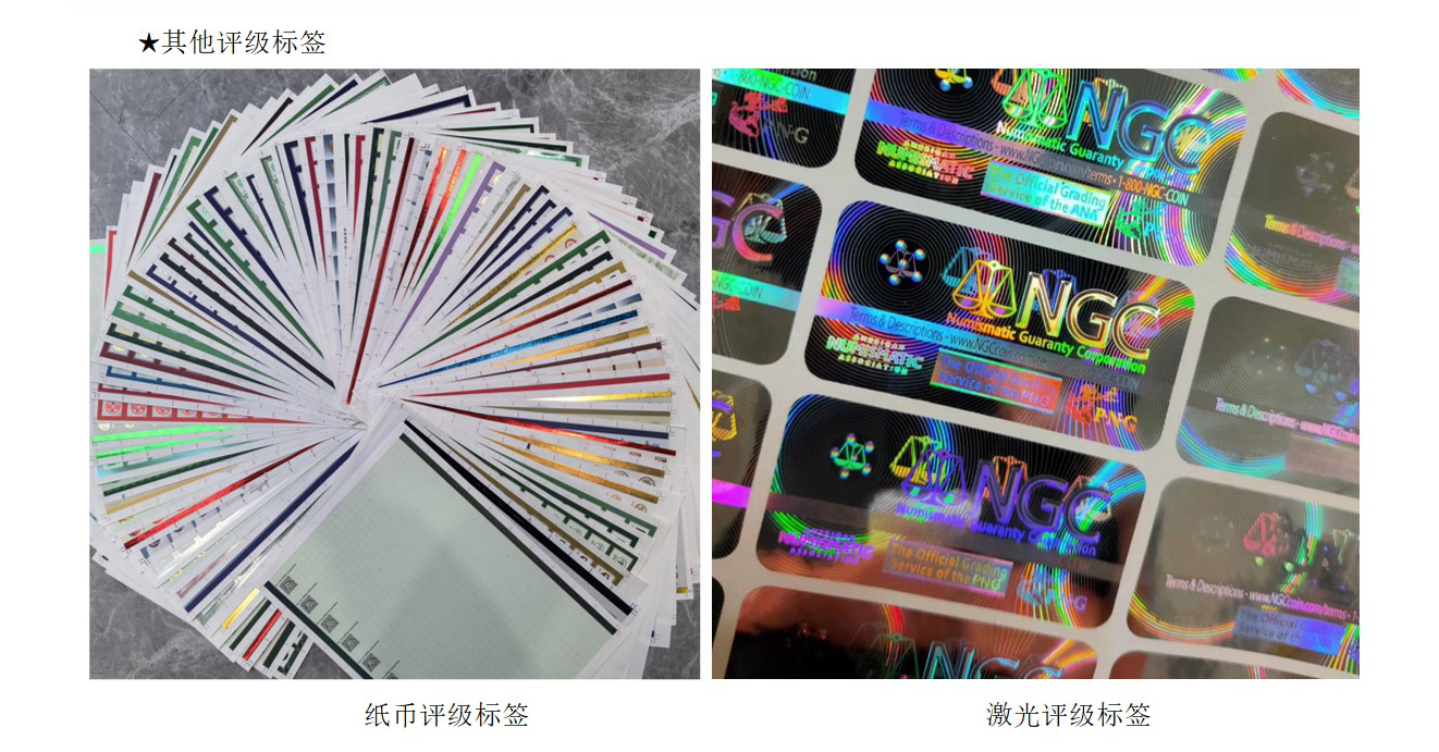 (6)从印刷角度讲,评级标签有(yǒu)以下几种:实線(xiàn)专色印刷(不同于传统的四色网点印刷,易识别)、四色、专色、彩虹印刷、丝网印刷、凹印等。