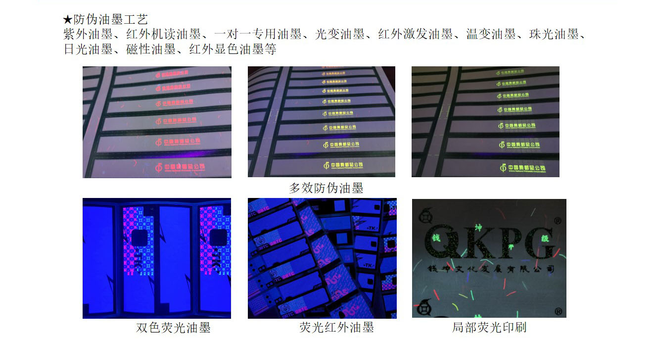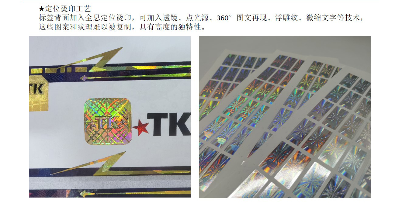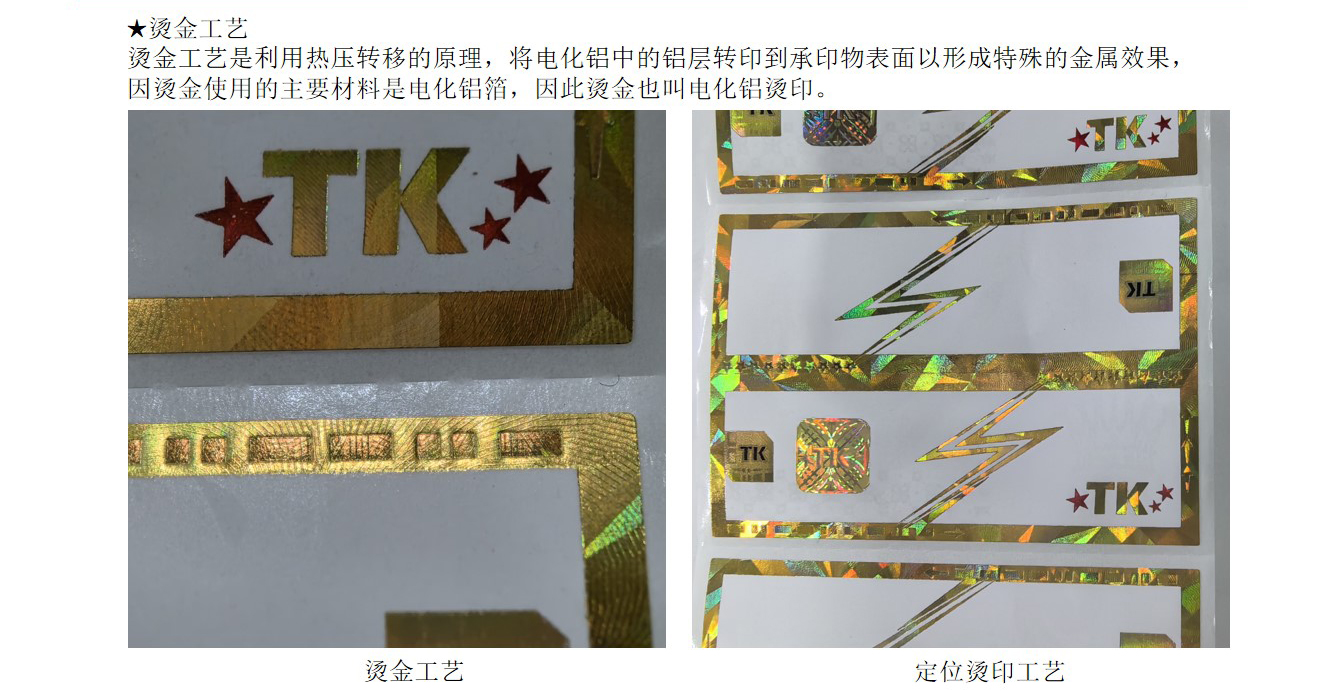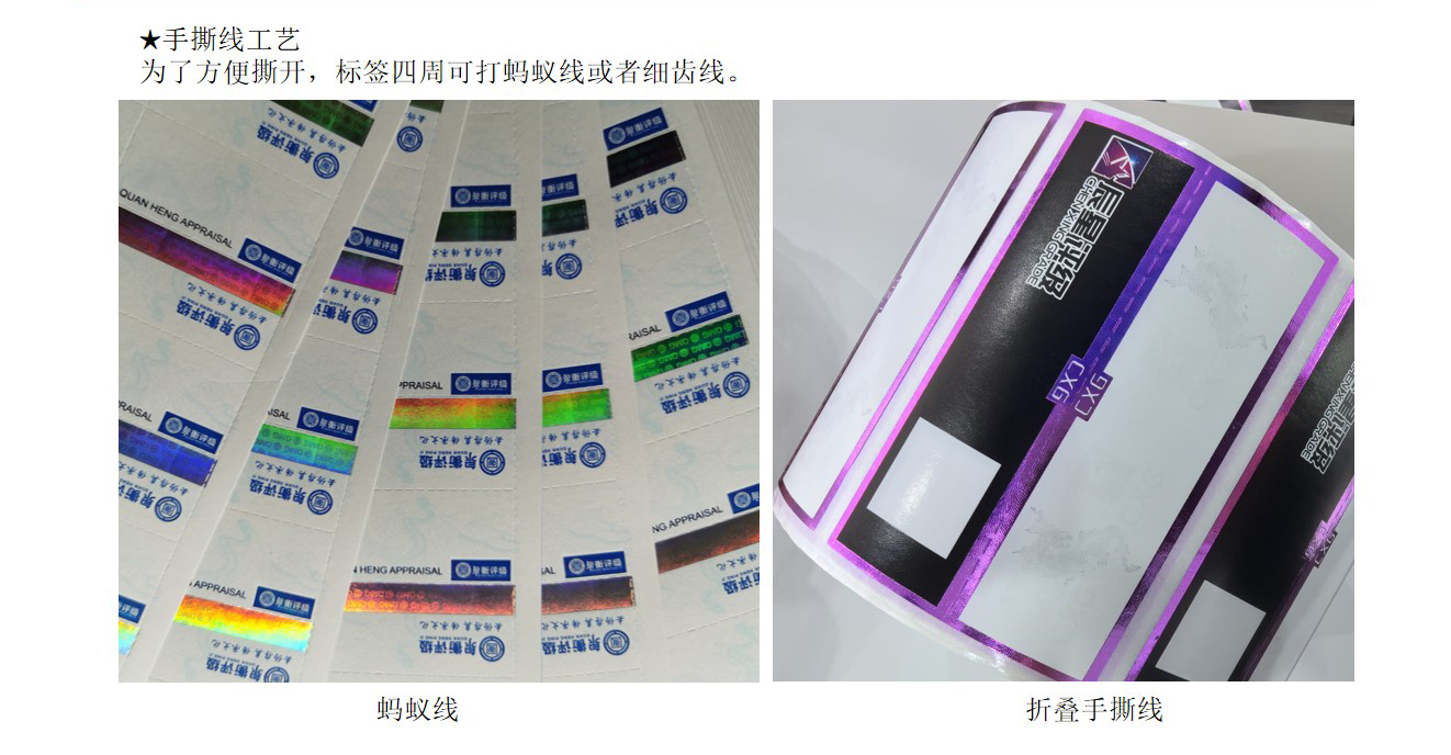 (7)后期工(gōng)艺:烫金、定位烫印、专版膜烫印、激光标签、打号、手撕線(xiàn)、激光打孔、角度变色烫印、镭射烫印、防伪油墨等。