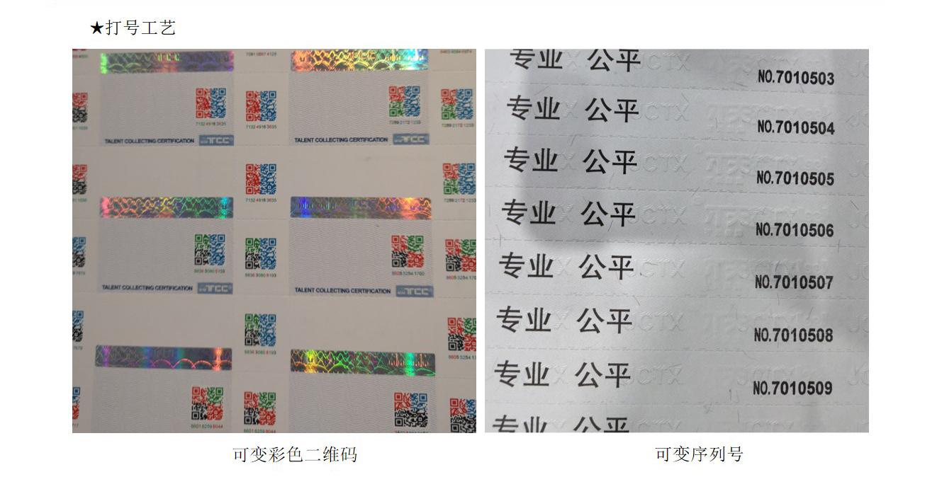 (5)从数码技(jì )术上讲:评级标签利用(yòng)计算机技(jì )术、通讯技(jì )术及密码技(jì )术生成无规则、不重复的防伪数码,真正做到一物(wù)一码,安(ān)全保密,防伪性能(néng)**。