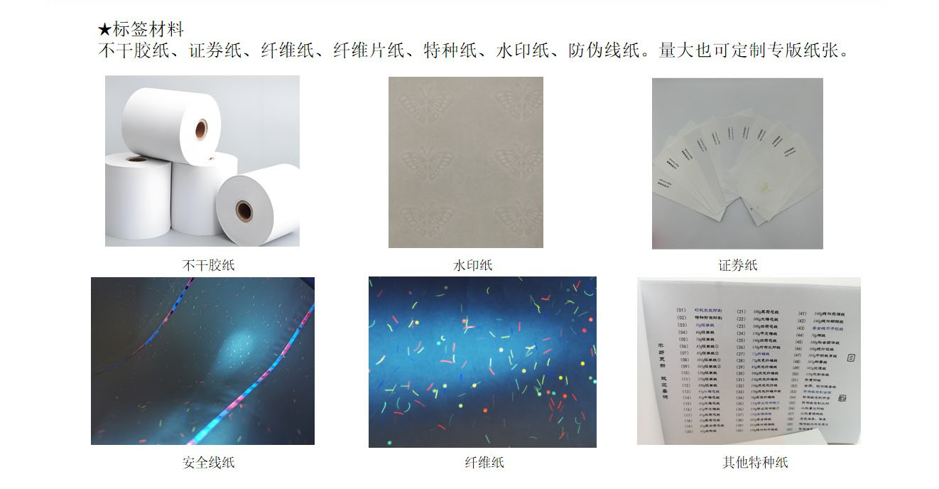 (2)从纸的类型来讲,评级标签有(yǒu)以下几种:不干胶纸,铜版纸,特种纸、纤维纸,安(ān)全線(xiàn)纸,水印纸,PET塑料材料等。