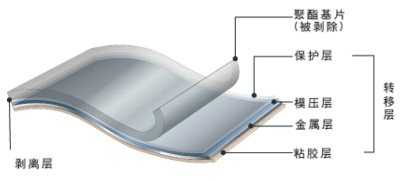 烫印膜其结构分(fēn)為(wèi):基础层、剥离层、颜色层、電(diàn)镀层、胶水层。可(kě)烫纸张、塑料ABS、PS、PVC、PP、PE、OPP等材料。