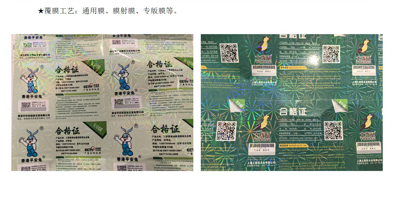 (1)从运用(yòng)材质(zhì)讲,防伪合格证有(yǒu)以下几种:有(yǒu)纸质(zhì)、激光全息、特种薄膜材料。