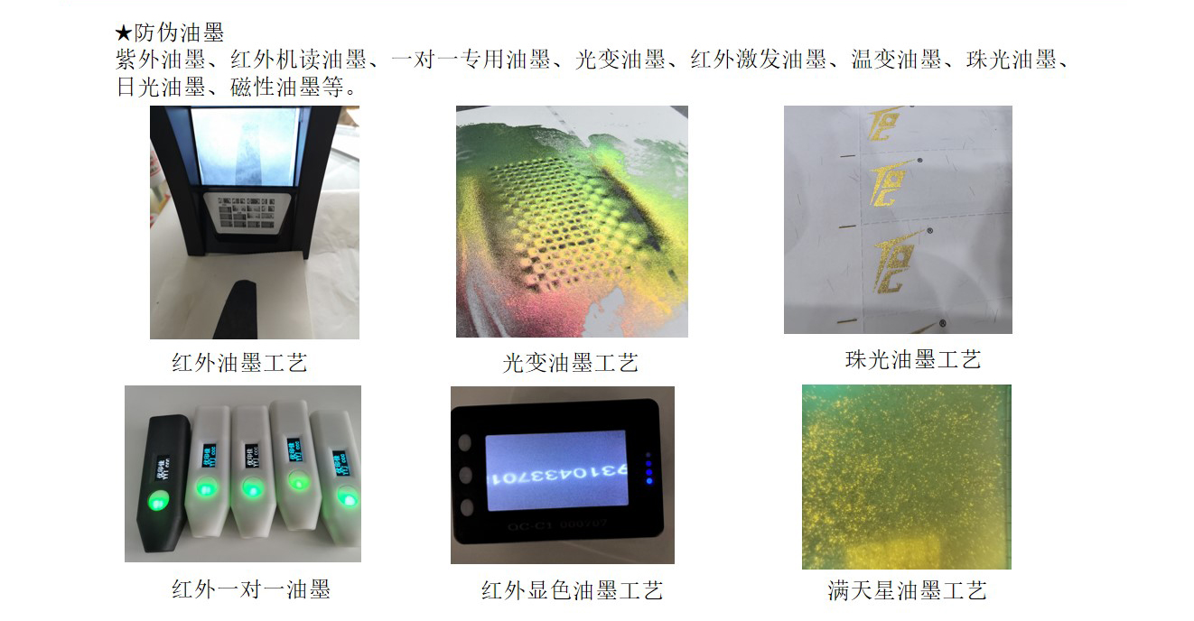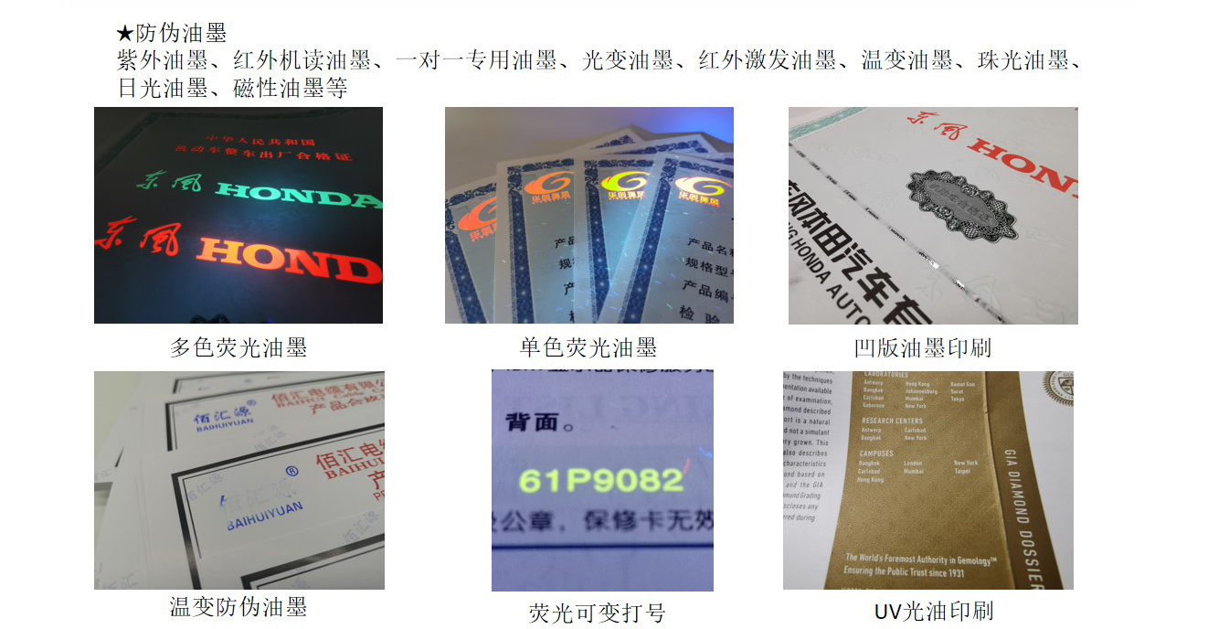 (3)从运用(yòng)油墨的角度来讲,防伪合格证有(yǒu)以下几种:普通的印刷油墨,特殊如温变色油墨、荧光油墨、光变油墨、遠(yuǎn)红外油墨等。