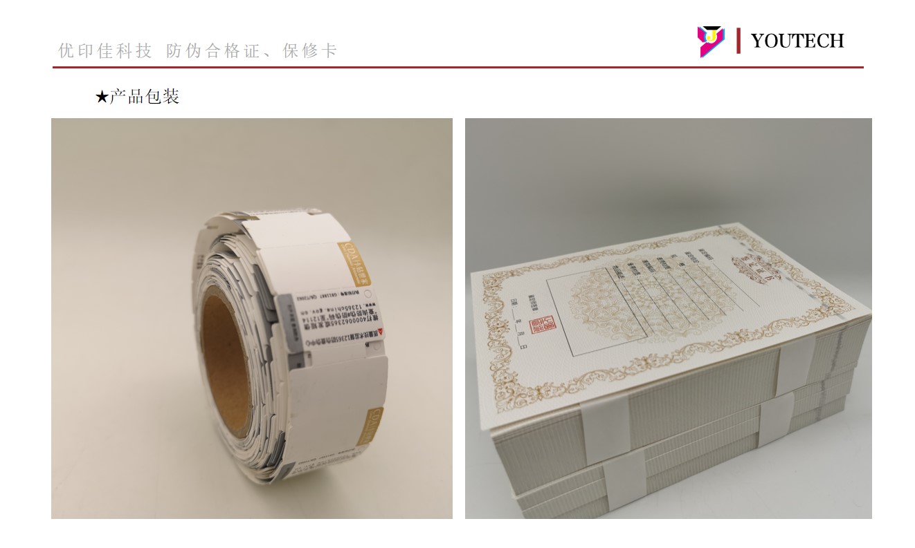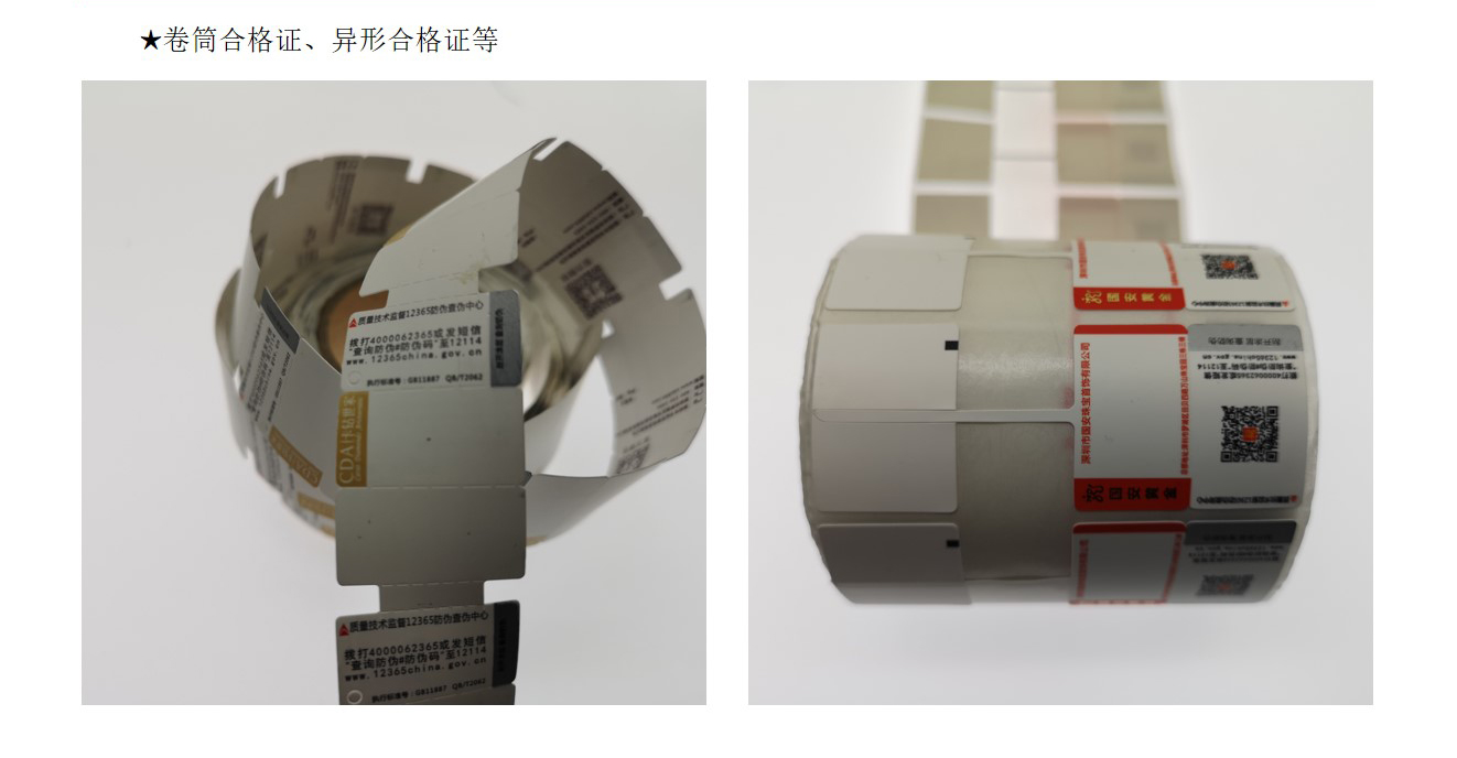 (2)从纸的类型来讲,防伪合格证有(yǒu)以下几种:不干胶纸,铜版纸,特种纸、纤维纸,安(ān)全線(xiàn)纸,水印纸,易碎纸,双层不干胶纸,薄膜材料PET材料等。