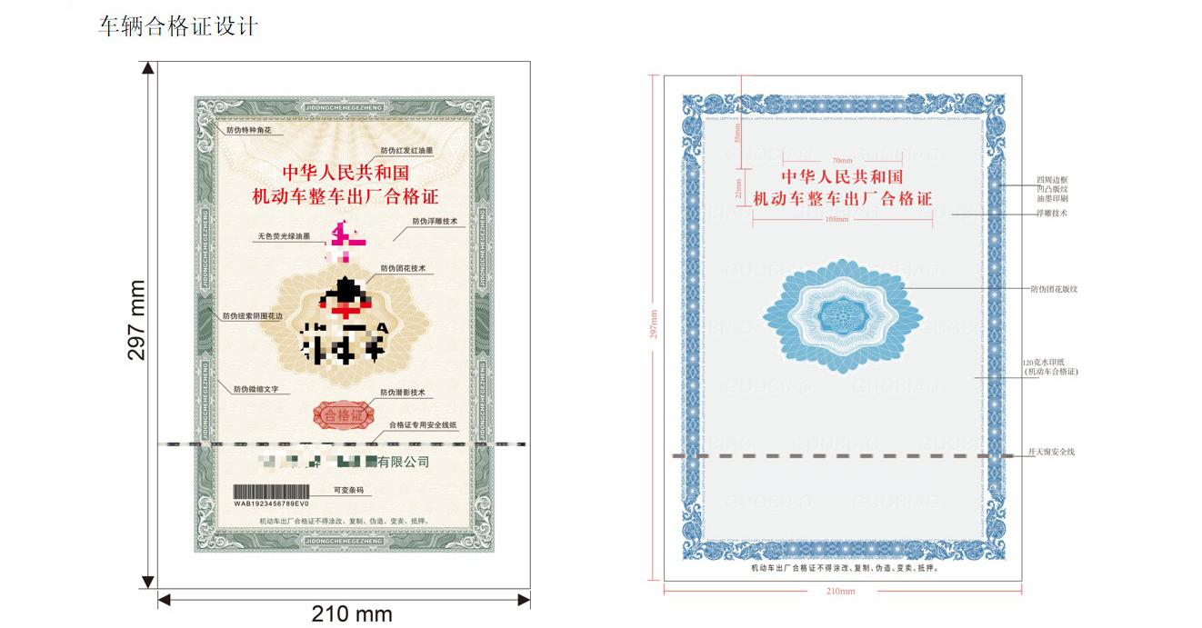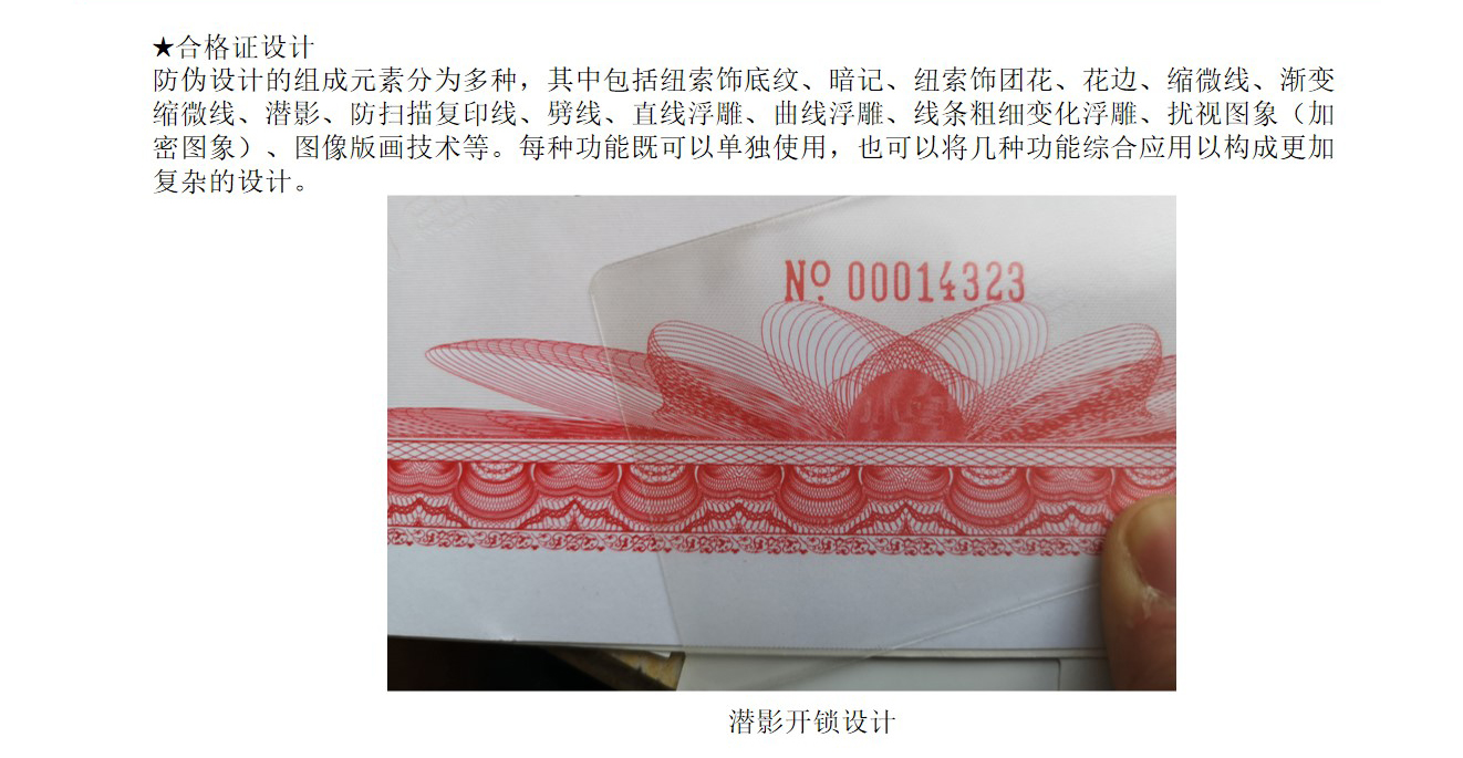 (4)从设计时采用(yòng)防伪版纹设计系统来讲,防伪合格证有(yǒu)以下几种:变形、二维浮雕式地纹、**文(wén)字或**图形、标识浮雕底纹,粗细線(xiàn)浮雕底纹、劈線(xiàn)、浮雕底纹、组合纽索团花(huā)、花(huā)边、纽索地纹、缩微文(wén)字、潜影技(jì )术、防复印、防扫描技(jì )术等。